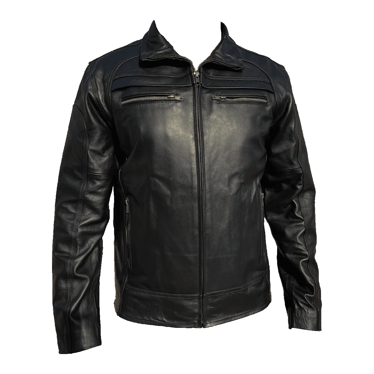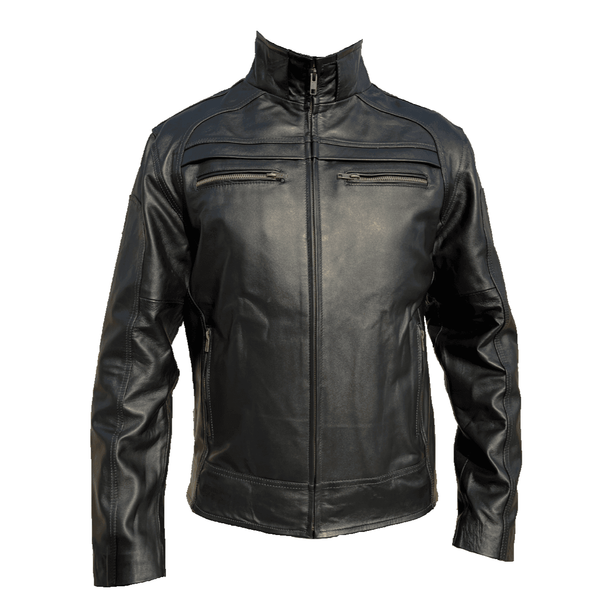 Chamarra Cuero Vacuno Hombre Empire - Cuello Alto Slim, Cierres y Bolsas
